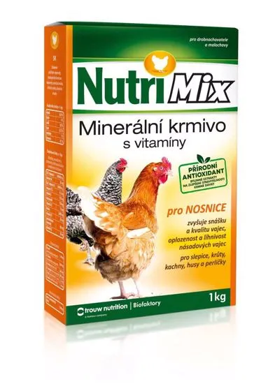 NutriMix jeurčený na doplnenie minerálných látok a vitamínov do kŕmnych dávok pre sliepky, kačice, husy, morky alebo prepeličky chované v drobnochovoch. Podporuje zvýšenie znášky, oplodnenosť a liahnuteľnosť násadových vajec. Zaisťuje dobrý zdravotný stav hydiny a zlepšuje využitie prijatých krmív. Pridáva sa do kŕmnej dávky, ktorá je založená na obilných šrotoch alebo iných neplnohodnotných krmivách, poprípade kuchynských zbytkoch atď. Odmerané množstvo prípravku sa podáva denne rovnomerne zamiešané do krmiva. Je nutné zaistiť trvalý prístup k zdravotne nezávadnej vode. Dávkovanie: - v období znášky: 100g na 10ks na deň - v období znáškového kľudu: 60g na 10ks na deň.