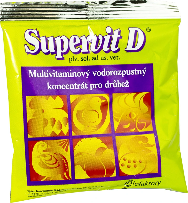 Indikácia: Supervit D je biologicky účinný vitamínový koncentrát určený pre nutričné použitie u všetkých druhov a kategórií hydiny, vyrobený z vodorozpustných vitamínov.