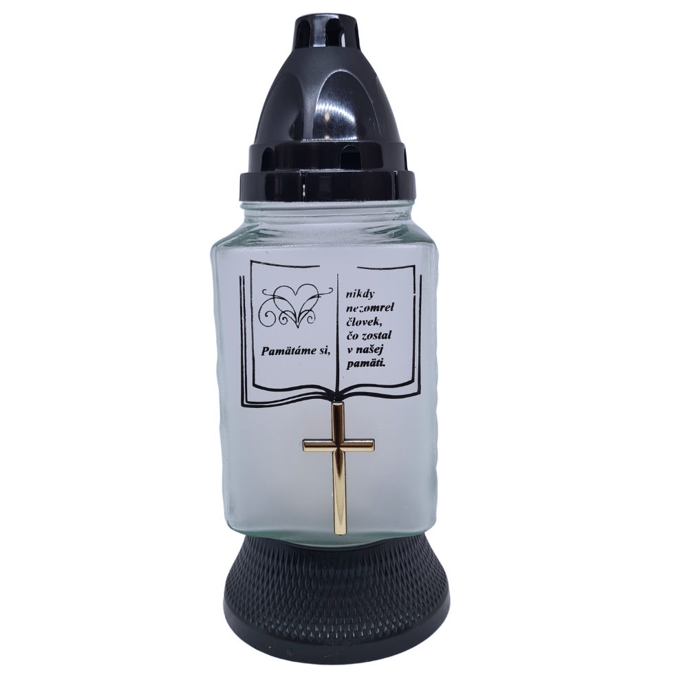 - Tento kahanec sa vyznačuje svojím jednoduchým a decentným dizajnom. Matné sklo na prednej strane vytvára jemné a príjemné svetlo, ktoré dopĺňa srdečný text . Tento kahanec pridáva hrobu pocit pokoja a úcty.